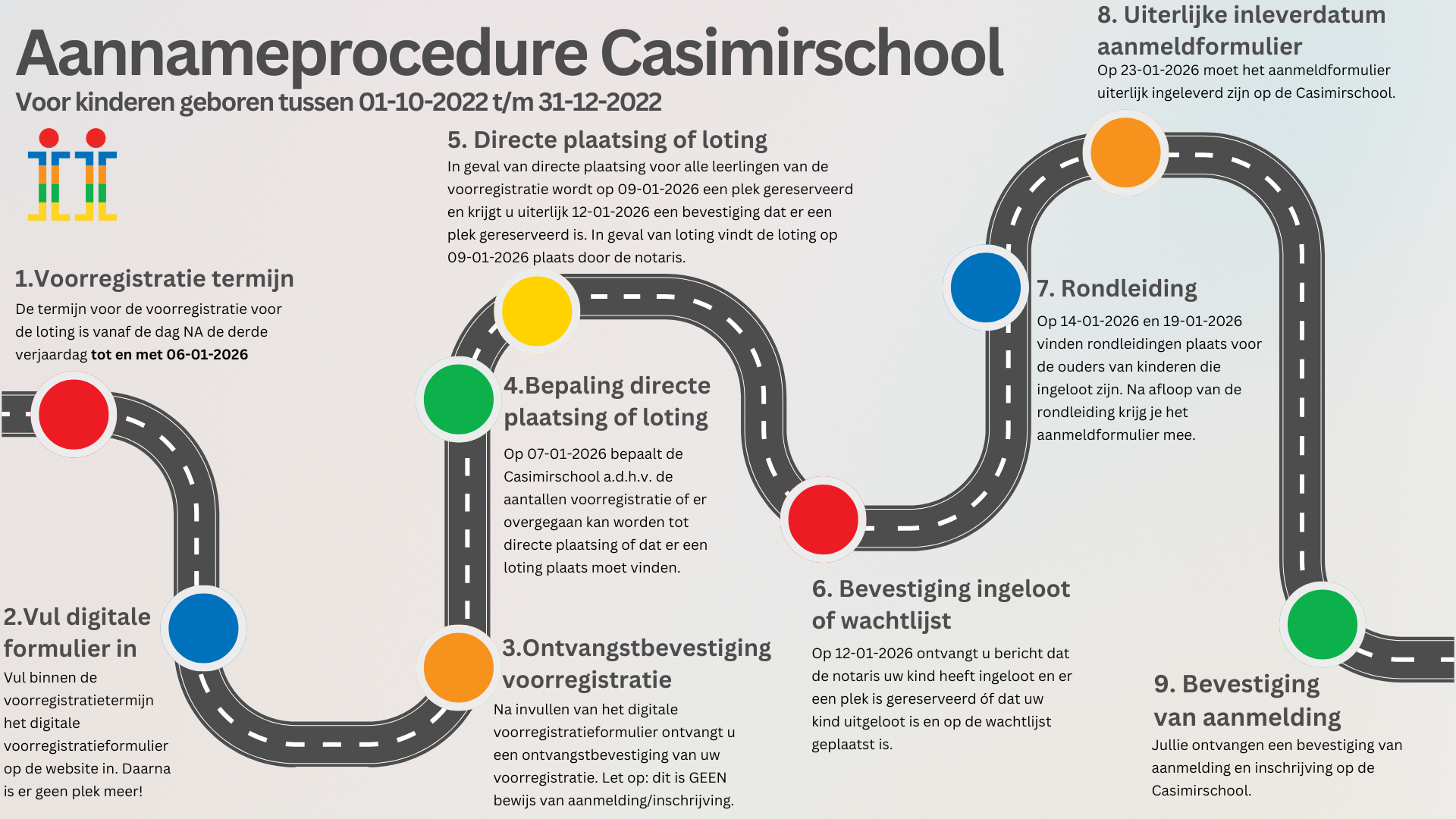 We informeren u graag over een wijziging in onze aannameprocedure. De aanleiding voor de wijziging, is dat de vraag naar het beperkt aantal beschikbare plekken op de Casimirschool groter wordt en de gewijzigde wettelijke kaders rondom inschrijving en kansengelijkheid.